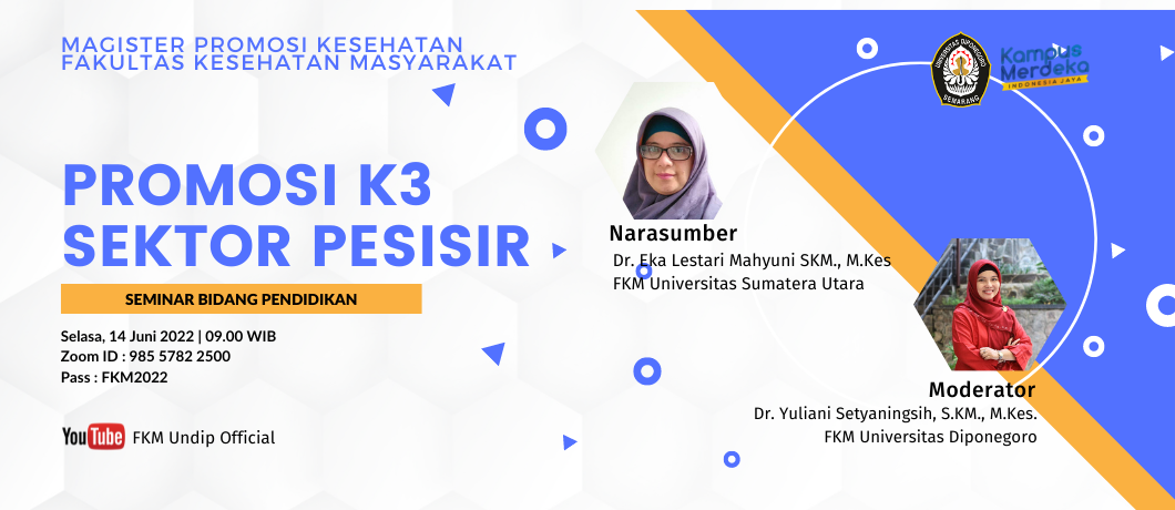 Magister Promosi Kesehatan FKM UNDIP menyelenggarakan Seminar Bidang Pendidikan dengan Tema Promosi Kesehatan di Sektor Pesisis. Kegiatan ini dilaksanakan secara daring dengan narasumber Dr. Eka Lestari Mahyuni SKM., M.Kes dari FKM Universitas Sumatera Utara. Kegiatan ini dilaksanakan pada Selasa, 14 Juni 2022 dengan menggunakan platform Zoom. Kegiatan yang dilaksanakan pada Selasa, 14 Juni 2022 ini dihadiri oleh mahasiswa Magister Promosi Kesehatan, Alumni serta Peserta lainnya. Kegiatan Berlangsung mulai pukul 09.00 WIB sampai dengan pukul 12.00 WIB. Kegiatan diikut oleh sekitar 100 orang peserta.