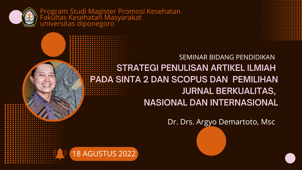 Kamis (19/8). Sebagai upaya meningkatkan kemampuan mahasiswa Magister Promosi Kesehatan dalam menulis artikel ilmiah untuk publikasi pada Jurnal Nasional Terakreditasi maupun Jurnal Internasional Bereputasi maka di selenggarakan Seminar Pendidikan dengan Tema “Strategi Penulisan Artikel Ilmiah Pada Sinta 2 Dan Scopus Dan Pemilihan Jurnal Berkualitas, Nasional Dan Internasional”. Kegiatan ini dilaksanakan pada tanggal 18 Agustus 2022 dan diikuti oleh mahasiswa baik mahasiswa SMT 1 maupun lainnya sebagai tambahan informasi dalam pembuatan artikel sebagai salah satu kewajiban mahasiswa di Program Studi Magister Promosi Kesehatan.